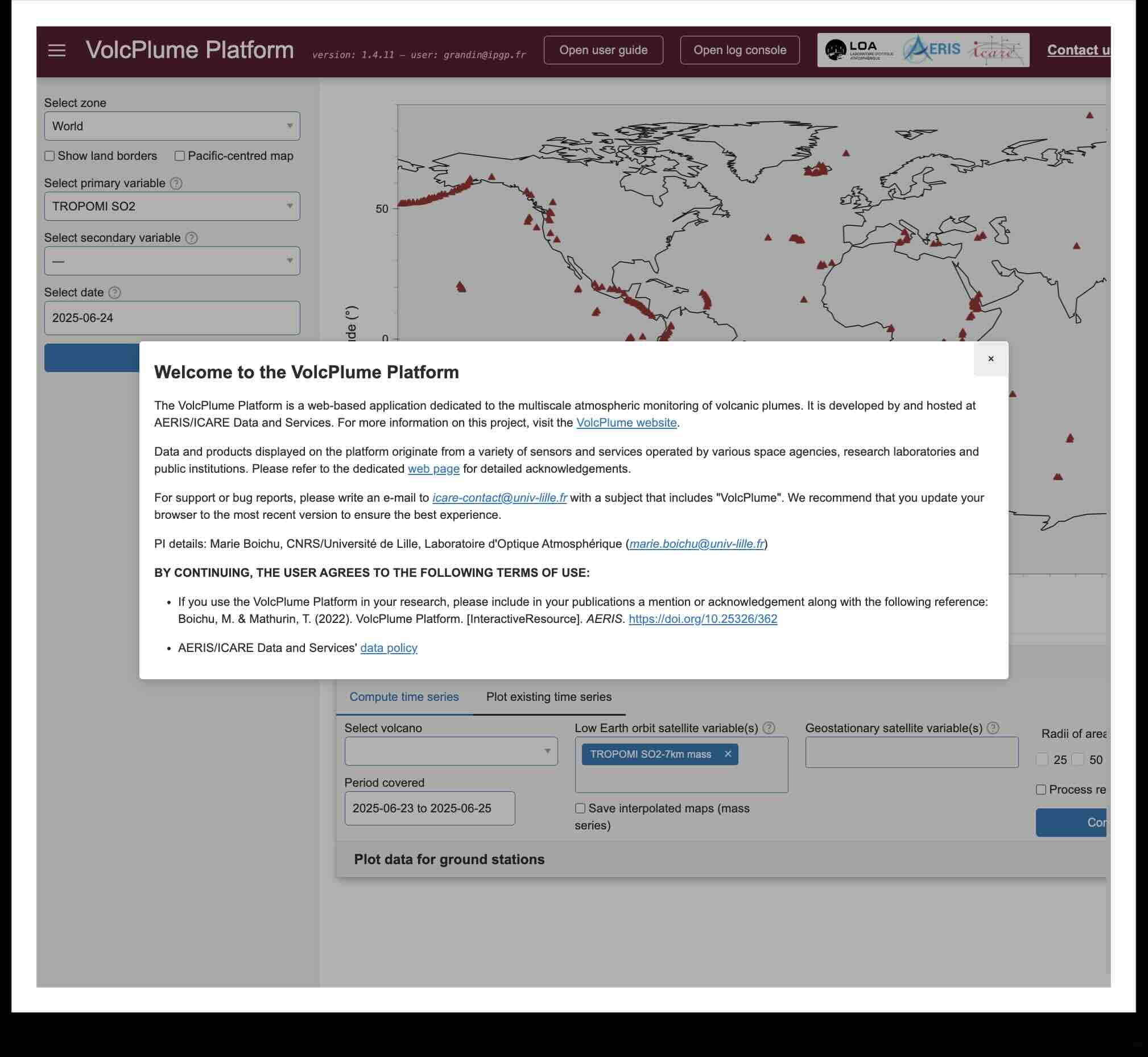 Content License: Creative Commons Attribution 4.0 International (CC-BY-4.0)Credit must be given to the creatorDownloadsDownloadConnect to the VolcPlume platformhttps://volcplume.aeris-data.fr/Volcano Space ObservatoryCompute SO2 massVolcano Space ObservatoryCompute SO2 mass