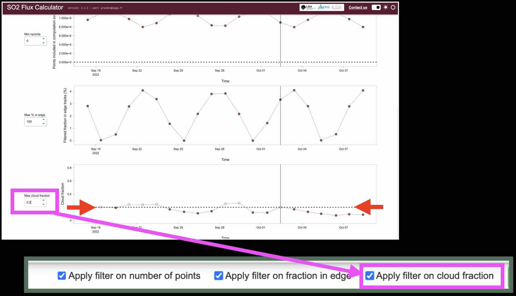 box, you will be able to adjust the maximum cloud fraction that defines the threshold between “bad” and “good” data (shown by the dashed horizontal line).